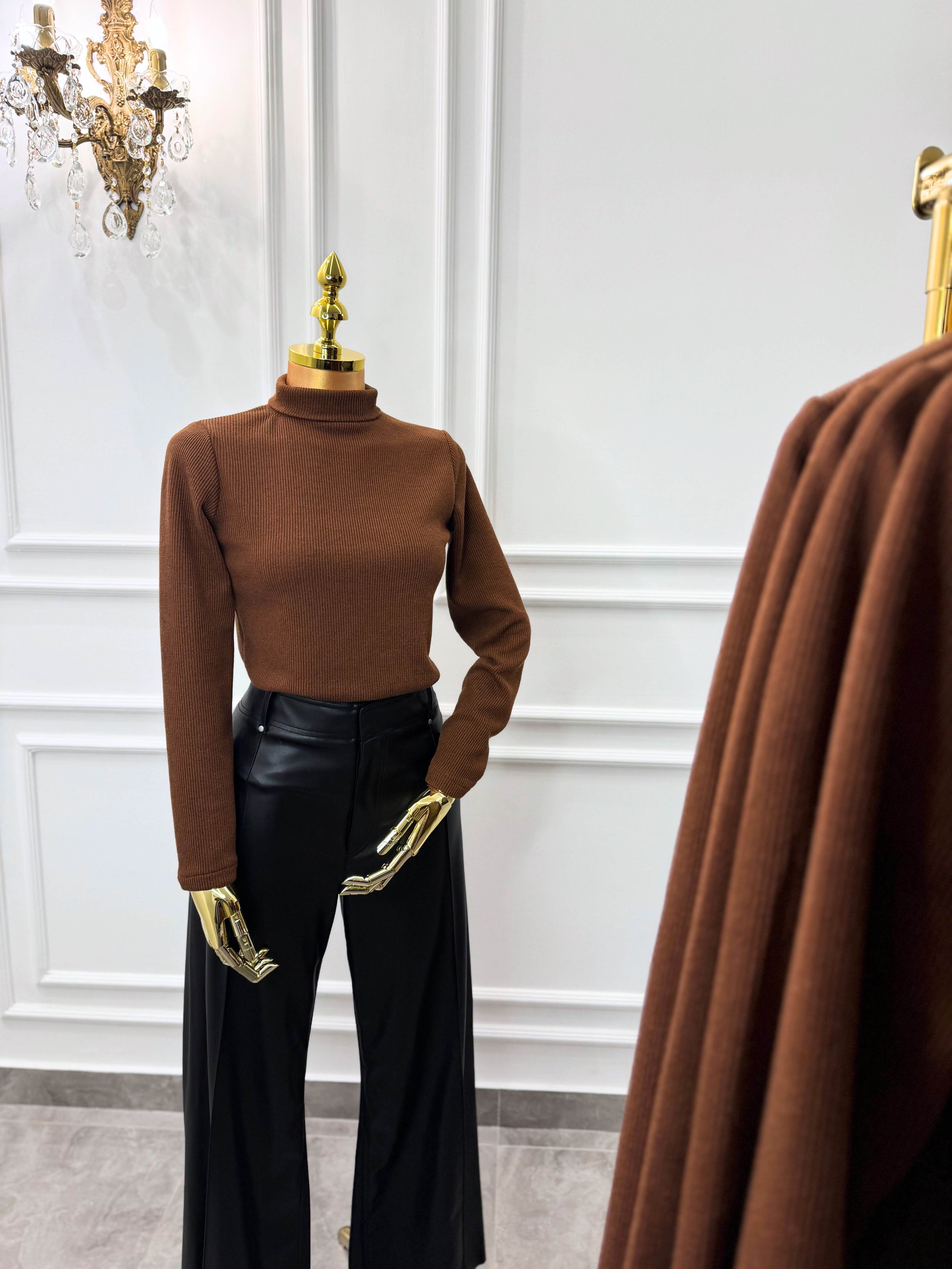 Rich cocoa rib with a polished mock neck and smooth, flattering fit—ideal for layering or wearing solo.