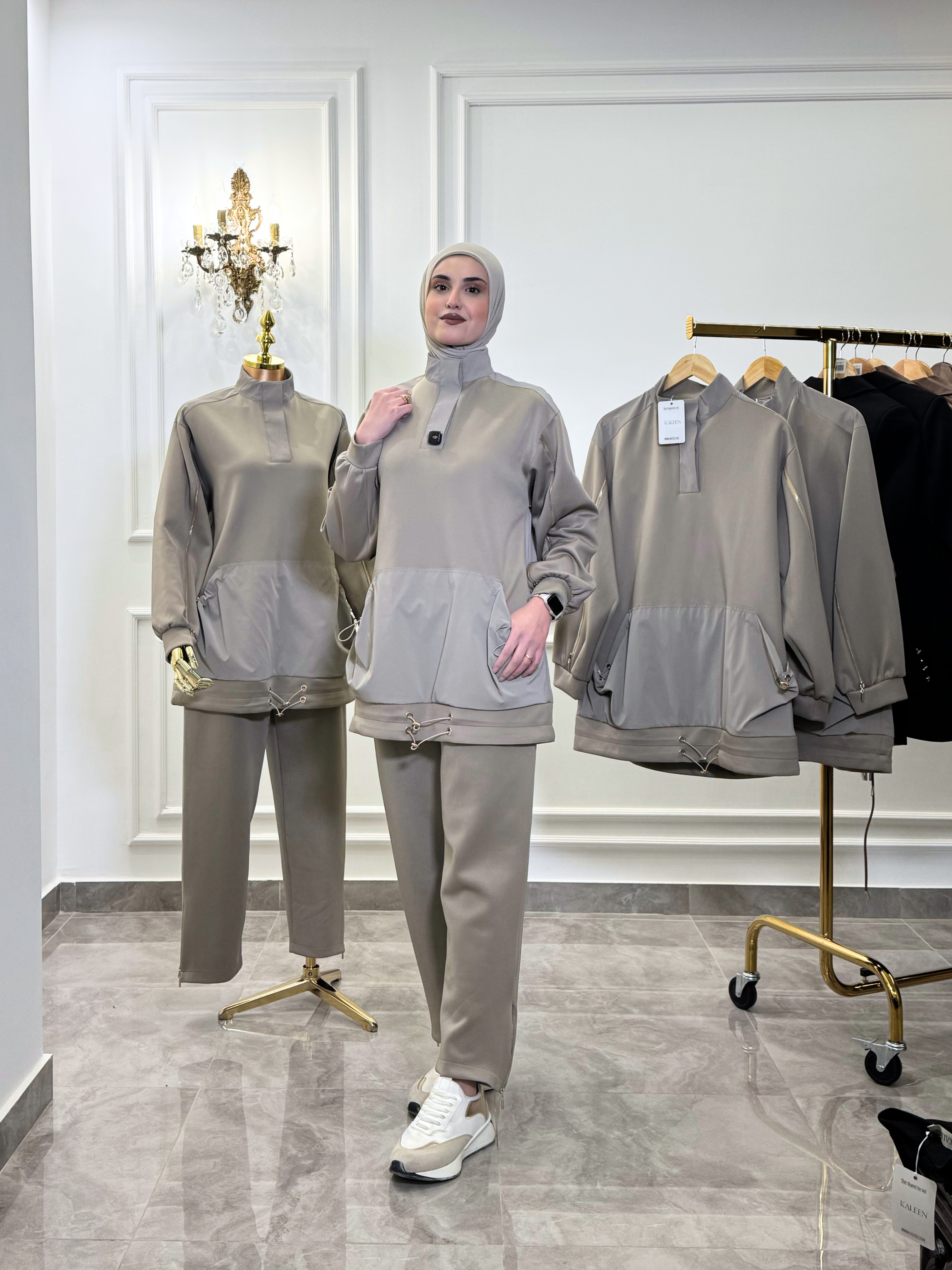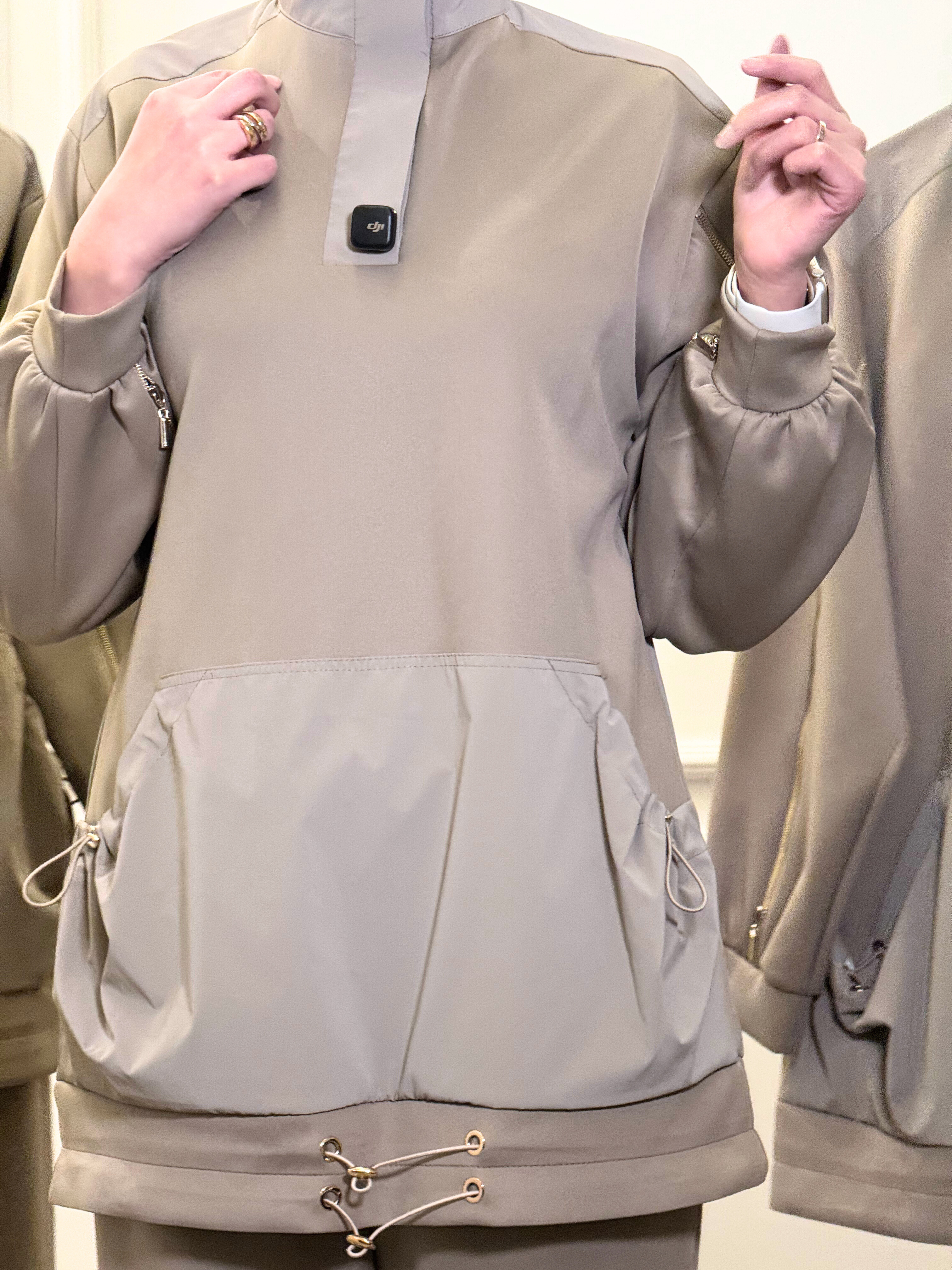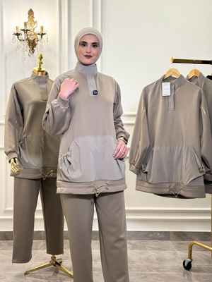 Crafted from a smooth, premium fabric, the top is detailed with a structured high neckline, subtle contrast panels, and functional zipper accents along the sleeves for a contemporary edge. The oversized front pocket and adjustable drawstring hem add both practicality and style. The matching pants complete the look with a clean silhouette that’s easy to dress up or down.