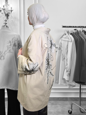 Featuring delicate floral embroidery enhanced with subtle bead detailing on the sleeves and back, it adds a refined feminine touch to a clean, modern silhouette. The relaxed fit ensures modest coverage, while the open-front design makes it easy to style over basics, knits, or dresses.
