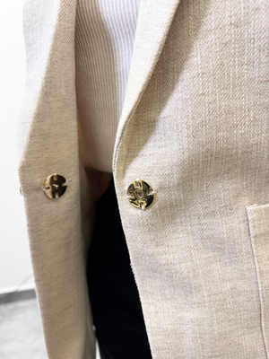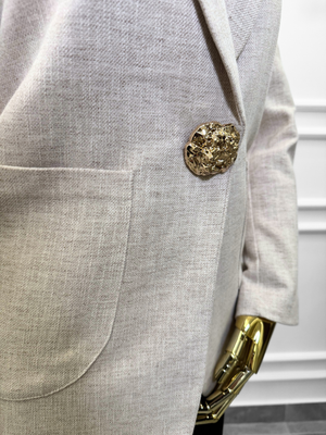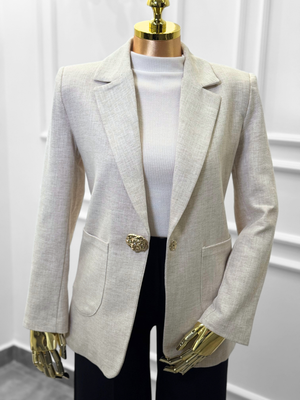 This timeless beige blazer adds sophistication and versatility to your wardrobe. Featuring a flattering tailored fit, a bold gold button closure, and sleek, clean lines, this blazer offers a polished look that transitions seamlessly from office to evening. Pair it with a blouse or a dress to elevate your style for any occasion. Perfect for those who appreciate elegance with a touch of glamour.